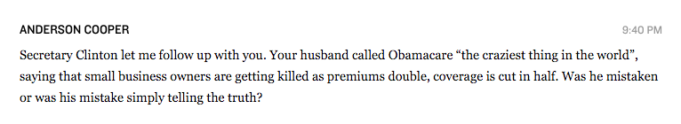 Trump’s chauvinist shadow may consume center stage, but Cooper’s question to Secretary Clinton regarding the ACA should also raise concerns, in particular as Clinton was asked about her husband’s opinions rather than her own.